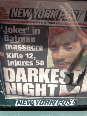 翻って事件発生後のNY。「The Dark Knight Rises」を目指し、映画館には長蛇の列が出来上がっていたので、少なくともNYの観客へのダメージはさほどでもなかったのかと。フェイスブックでも、「バットマンの最新作、観に行かないWanna watch the latest Batman, anyone?」という書き込みもみられました。