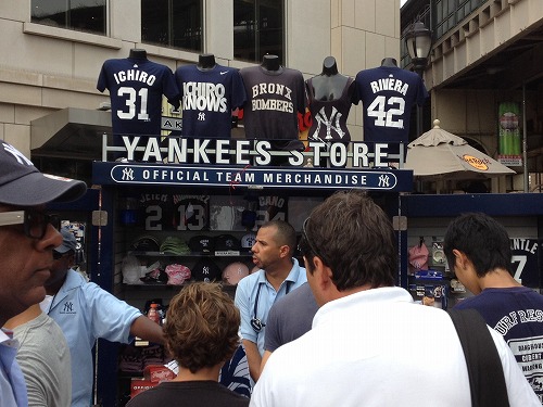 スタジアムの前に陣取るギフトショップには、うれしいことに「ミスター・ヤンキース」のジーターを抑え、イチローのTシャツが!!しかも2枚並んでました~。誰もが持っているジーターのTシャツよりも、移籍まもないイチローの方が売れ行きが良いのでしょう。イチローがその守備のごとく、ヤンキース・ファンの心をがっちりキャッチしているのが十分伝わってきます。