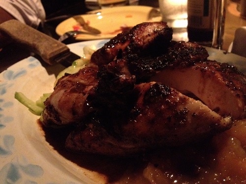 ジャマイカンといえば、これを食べなきゃダメでしょう。と思って、家人とともに「ジャーク・チキンJerk Chicken)をチョイス。ジャークと呼ばれるスパイスを駆使したアイランド風BBQですね。一切れ口に放り込んだだけで、額に汗がにじむくらいスパイシーなんです!辛いもの好きの私には、程よい加減で満足満足。家人にはちょっと辛過ぎたのか、水をガブガブ飲んでました。