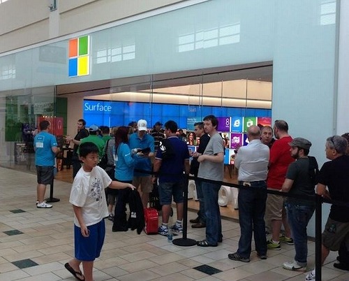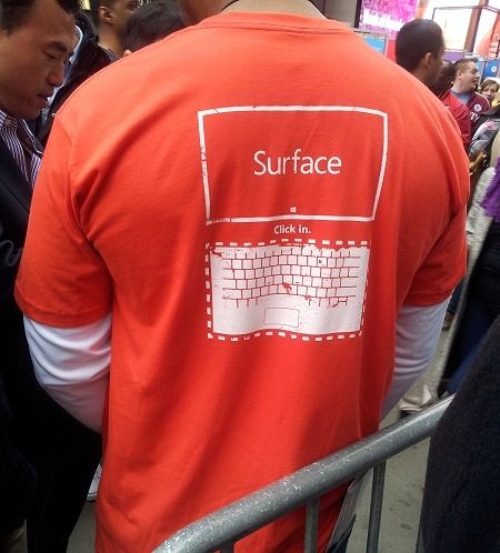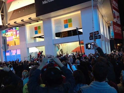 バリケードで整理された区画がものものしく、まるでアップルの新製品セール開始日のよう。しかし・・・もちろん11月2日ではないので、アップルのiPad MINIの発売日ではありません。これ、何とタブレット「サーフェス」を求めに、タイムズスクエアに臨時で開設したマイクロソフトストアに詰め掛けた人の群れなんです。行列といえばアップルの専売特許でしたが、マイクロソフト、発売初日でアップルのお株を奪ったも同然ですね。発売初日の1日前には、600人が行列を作っていたそうですし。