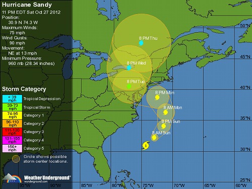 なぜなら・・ハロウィーン直前の30日、NYをはじめニュージャージー州やコネティカット州などトライステート・エリアをハリケーン「サンディ」が直撃する危険が迫っているから!オバマ米大統領はハリケーン「サンディ」の脅威を警戒し、スウィング・ステートで知られるヴァージニア州の29日の訪問をキャンセルせざるを得ませんでした。だって「サンディ」は現時点でこそ「カテゴリー1」に分類されるものの、西からの強い寒冷前線と一体化して100年に一度の未曾有の「パーフェクトストーム」、あるいは「フランケンストーム」へ勢力を巨大化させるリスクが潜んでいるんです。