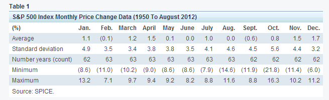 1950年から2012年8月までのS&P500指数、月ごとのパフォーマンスを追ってみました。 平均で最悪のパフォーマンスを示したのは9月で、0.57%のマイナスだったんです。反対に10月から12月にかけ、リバウンドする経験則が表れています。9月の下落の後は、10-12月で平均で4.0%反発することが分かりますね。