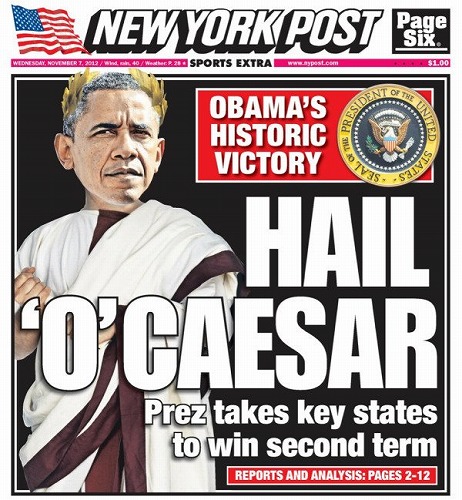 地元紙とはいえ保守的な論調がウリのNYポスト紙、オーナーは保守系フォックス・ニュースとともにメディア王ルパート・マードック氏率いるニューズコープでございます。同紙、ここまで強烈な皮肉を思いつくほどオバマ再選に怒り心頭だったのでしょうか。