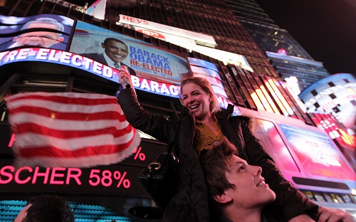 再選決定後、数多くのオバマ支持者が集まったタイムズ・スクエアでは歓喜がほとばしる!