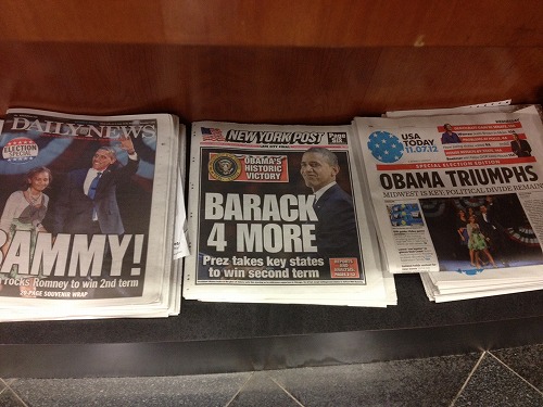 午後11時半頃と、オバマ再選が決定した時間は日にちが変わる前でしたから、翌日の各紙はオバマ一色!選挙当日にロムニー候補への投票を呼びかけたNYポスト紙をはじめ、デイリー・ニュース、USAトゥデーが向こう4年の歴史を飾る「顔」を用意しました。