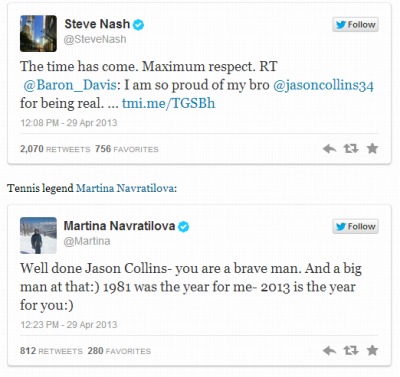 ジェイソンのカミングアウト後は、NBAコミッショナーのデビッド・スターンをはじめスポンサーのナイキ、果てには同性婚を支持するオバマ米大統領夫妻から勇気ある行動に拍手喝采!!ビル・クリントン元大統領をはじめ、NBAからもスター選手のコービー・ブライアント、スティーブ・ナッシュも賛辞を送っております。1981年にバイセクシュアルを宣言したマルチナ・ナブラチロワは懐かしいですねぇ~。