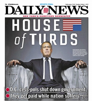 「House of Turds」のTurdsは下衆、Houseは米下院を意味しますから、直訳すると「下衆の米下院議員」。債務上限の引き上げに待ったをかける共和党多数派の米下院を、痛烈に批判しているんです。それだけではありません。オスカー監督デビッド・フィンチャーがメガホンを取り、オスカー俳優ケビン・スペイシーが主演を張る史上最高のサスペンス政治ドラマ「ハウス・オブ・カーズ(House Of Cards)」に引っ掛けてるんですね~。