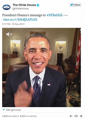 クリスチャン・ベールだけではありません。マイルズくんの願いをかなえるイベントには、オバマ米大統領もツイッターの新サービス「ヴァイン」通じエールを送ったのです。6秒のマイクロビデオを大統領が使ったのは、今回が初めて。サンフランシスコ市だけでなく、ホワイトハウスまで一体になった心温まる日となりました。