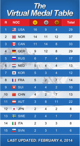 最初にご紹介したインフォトラーダ・スポーツに視線を戻して、わが日本に注目してみると・・金メダル別では2個で12位、メダル総数では8個でこちらも12位でした。1998年の長野五輪で過去最高を記録した金5、銀1、銅4の計10個を下回る見通しです。ソチでは浅田真央選手を始めとしたフィギュアスケート陣が金メダルをもぎ取るのか、はたまた女子ノーマルヒルの高梨沙羅選手などジャンプ陣がさらっていくのか。胸が高鳴る戦いの火蓋が、今切って落とされます!