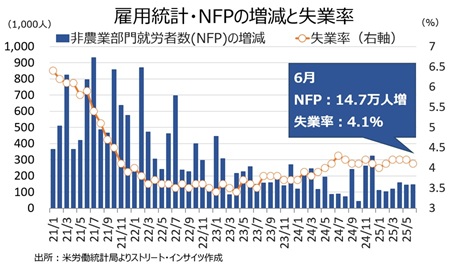 米6月雇用統計・非農業部門就労者数(NFP)は前月比14.7万人増となり、市場予想の11万人増を上回った。前月は13.9万人増→14.4万人増と上方修正され、過去分を含め好結果となった。