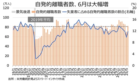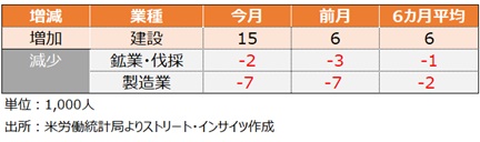 財生産業は前月比0.6万人増、4カ月ぶりに減少した前月から増加に転じた。業種別をみると、建設が同1.5万人増と5月連続で増加したが、製造業は関税の影響か同0.7万人減と2カ月連続で減少した。鉱業・伐採も0.2万人減と2カ月連続で落ち込んだ。