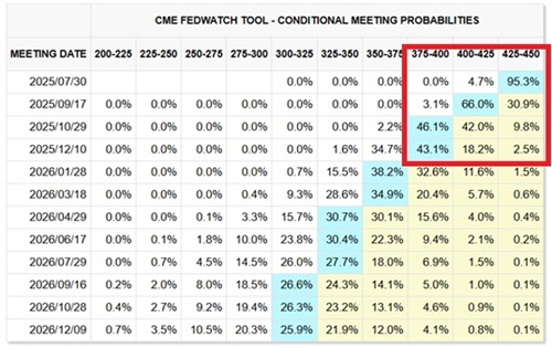 米6月雇用統計の結果を受け、FF先物市場で7月の利下げ織り込み度は前日の25.8%→4.7%へ落ち込みました。9月の利下げ確率(0.5%+0.25%)も前日の96%→69.1%へ低下。年内3回利下げ予想も、2回へ巻き戻されています。