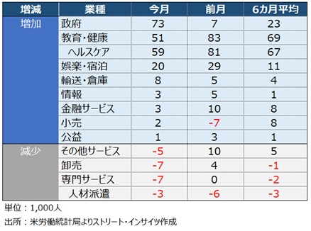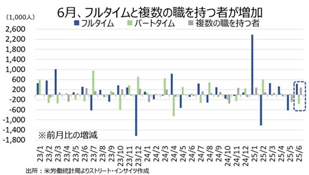 サービス部門のセクター別動向は11業種中で8業種で増加し、前月の速報値ベースと一致した。今回最も雇用が増加した業種は政府で前月比7.3万人増と、24年3月以来の強い伸びだった。連邦政府の減少を州・地方政府が完全に相殺した。しかし、カリフォルニアやニューヨーク、テキサスなど州・地方政府の多くは6月に年度末を迎えるため、季節調整要因でかさ上げされた印象。あるいは、政府効率化省(DOGE)による人員削減を受け、州・地方政府へ転職した可能性を示唆する。2位は前月まで19カ月連続でトップだった教育・健康で、続いて娯楽・宿泊が入った。一方で、専門サービスは2カ月連続で減少したほか、その他サービスや卸売が減少した。その他サービスの雇用減は、米Q1実質GDP成長率・確報値の個人消費で、娯楽が20年Q2以来の落ち込みを見せた結果と整合的だ。