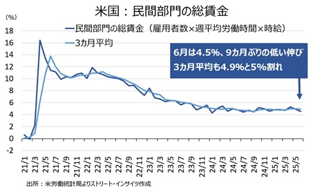 民間部門の総賃金(雇用者数×週平均労働時間×時給)は、賃金の伸びが鈍化したため前月比横ばいと、増加基調を10カ月で止めた。前年同月比は4.5%増と9カ月ぶりの低い伸び。3カ月平均は4.9%増と、3カ月ぶりに5%を割り込んだ。