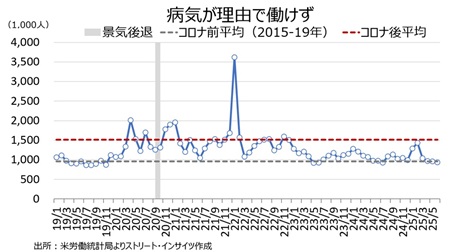「病気が理由で働けない」とする人々は、前月比ほぼ横ばいの93.4万人へ減少。コロナ前平均の2015‐19年の平均値の93万人にほぼ並んだ。