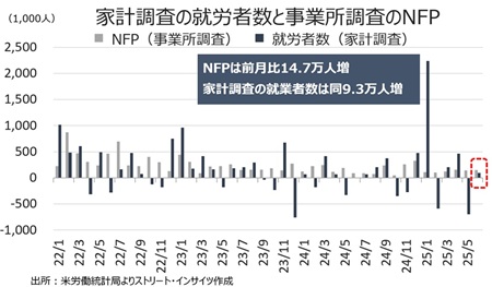 今回、事業所調査(給与台帳ベース、NFPや平均時給、週当たり労働時間など、CES)と家計調査(聞き取り調査ベース、失業率や労働参加率など、CPS)の就業者数の数字を比較すると、家計調査の就業者数は前月比9.3万人増と前月の減少から改善、NFPの14.7万人増と同じく増加した。