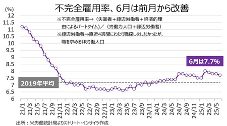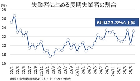 失業者とは、①失職中、②過去4週間に職探しを行なった、③現在、勤務が可能――の3条件を満たす必要がある。失業期間の中央値は前週の9.5週から10.1週と概ね4月の水準へ戻した。また、27週以上にわたる失業者の割合は前月の20.4%→23.3%2022年2月以来の水準近くへ上昇した。