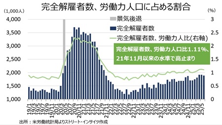 チャート:労働人口に占める完全解雇者の割合、2021年11月以来の高水準近くを維持