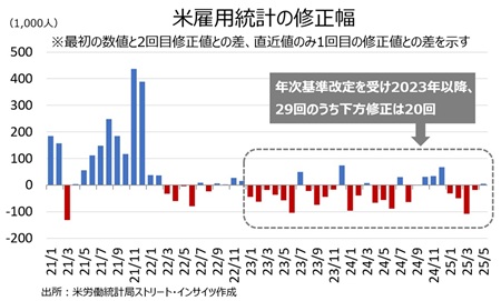 4月の1.1万人の上方修正(14.7万人増→15.8万人増)と合わせ、過去2カ月分で1.6万人の下方修正となったこれで、2023年以降では、29回のうち9回目の上方修正(20回は上方修正)となった。