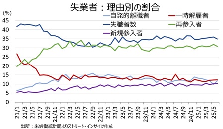 失職者数(一時的な解雇ではなく再編やM&Aなど会社都合での解雇者、派遣など契約が終了した労働者)は、前月比15.0万人減の243.3万人と5カ月ぶりに250万人を割り込んだ。失職者数の割合は6カ月ぶりの水準へ上昇した前月の36.0%→34.9%へ低下も、失業者のシェアで1位を維持した。失職者のうち、完全解雇者が労働人口に占める割合は前月の1.11%と、2021年11月以来の高水準を維持した前月の1.12%と概ね変わらず。レイオフ(一時解雇)は86.0万人と3カ月ぶりに減少した。ただし、他と比較して小幅だったため、失業者に占めるレイオフの割合は前月の12.2%→12.3%へ上昇した。再参入者は前月比14.3万人減の214.5万人と、2021年8月以来の高水準だった前月から減少。新規参入者も同1.5万人減の71.0万人と、2017年4月以来の水準へ増加した前月を下回った。結果、それぞれのシェアは再参入者が前月の31.9%→30.8%へ低下した一方で、新規参入者が前月の10.1%→10.2%へ上昇した。