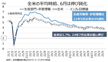 チャート:全米と生産労働者・非管理職の平均時給は伸び鈍化
