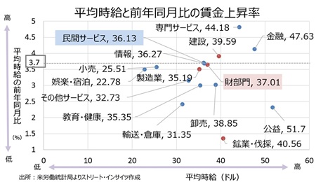その他、金融、建設、情報、小売も平均時給の伸びを上回った。一方で、マイナスとなった業種は速報値ベースで3業種(製造業、教育・健康、公益)となり、前月の3業種(情報、小売、公益)と並んだ。