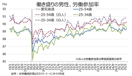 ・25~34歳(白人) 90.9%と24年7月以来の高水準、前月は90.8%、24年7月は91.3%と19年3月以来の水準に並ぶ