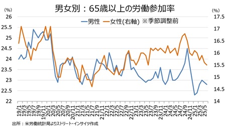 65歳以上の高齢者の労働参加率は、男女ともに低下した。ただし、これらは季節調整前の数字となる。