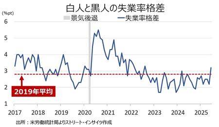 白人と黒人の失業率格差は拡大。白人の失業率が低下した一方で、黒人の失業率が上昇したため、失業率格差は前月の2.2ポイント→2.8ポイントへ拡大し、2019年平均に並んだ。