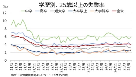 学歴別の失業率は中卒と大学院卒を除き低下した。