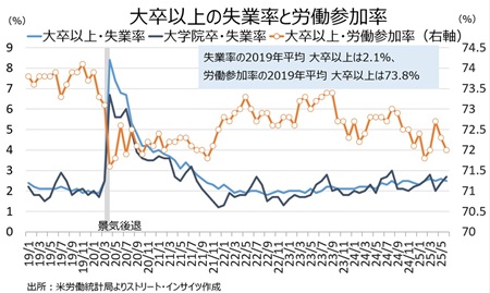 チャート:大卒以上の労働参加率、労働参加率は2カ月連続で低下したが大学院卒の失業率は2カ月連続で上昇