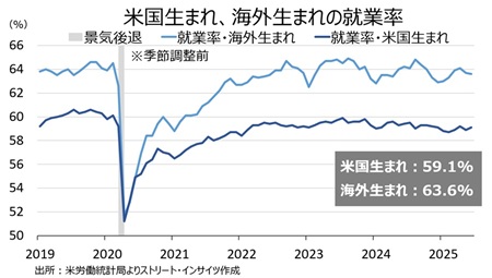 2024年の米大統領選でトランプ氏が勝利した理由は、不法入国者を含めた移民の急増だった。米議会予算局やサンフランシスコ連銀など、多くが移民の急増をめぐる影響を分析するように、足元の米労働市場にも大きな変化をもたらしている。そこで、海外生まれ(不法移民を含む)と米国生まれの雇用動向を確認してみた。