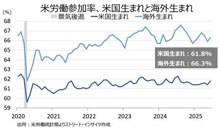 労働参加率は、そろって上昇米国生まれは労働力人口の増加に合わせ前月の61.4%→61.8%と24年12月以来の高水準となった。海外生まれも24年1月以来の66%割れへ低下した前月の65.9%→66.3%へ改善。全米の労働参加率は62.3%と22年12月以来の低水準だったが、これらは季節調整前の数字である点に留意していただきたい。なお、海外生まれは就労ビザを取得して入国した者が多いほか、家族に頼れない事情もあり、労働参加率で米国生まれを上回る傾向が強い。