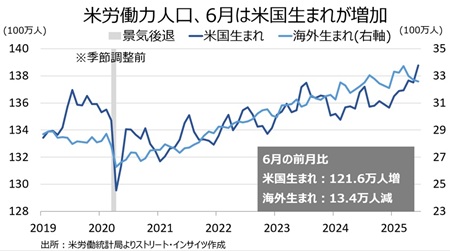 労働力人口(以下、全て季節調整前の数字)にうち、米国生まれは121.6万人増(前月は13.6万人減)と大幅増に転じたが、海外生まれは13.4万人減(前月は29.8万人減)と3カ月連続で減少した。一因に、トランプ政権下での不法移民取り締まりの強化が挙げられ、カリフォルニア州ロサンゼルスを起点に抗議活動が広がったことが思い出される。