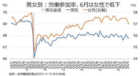 男女別の労働参加率は、まちまち。男性は前月の67.8%と3月以来の低水準を維持した一方、女性は57.0%と22年12月以来の57%割れが迫った。