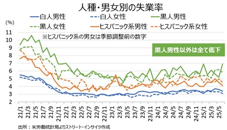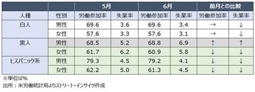 人種・男女別の失業率は、労働参加率が横ばいあるいは低下に合わせ、黒人男性を除き前月を下回った。ただし、労働参加率が上昇した黒人男性のみ、前月比1.7ポイントも急伸した。