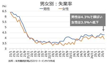 男女の失業率は労働参加率につれ、まちまち男性は労働参加率が前月と横ばいだったため、失業率は4.3%で変わらず女性は労働参加率が低下した結果、失業率は前月の4.2%→3.9%と24年9月以来の4%割れを迎えた。なお、女性は2023年1月に3.3%と1952年9月以来の低水準を記録していた。
