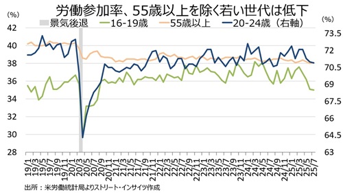 チャート:16~19歳、20~24歳、55歳以上の労働参加率