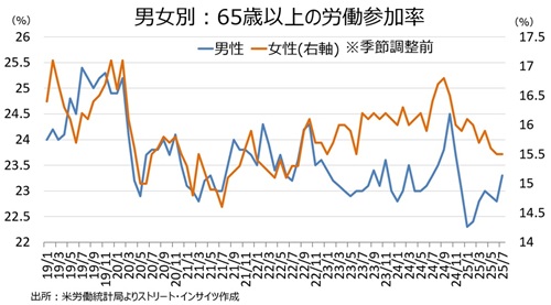 65歳以上の高齢者の労働参加率は、男性で上昇し女性が低下した。ただし、これらは季節調整前の数字となる。