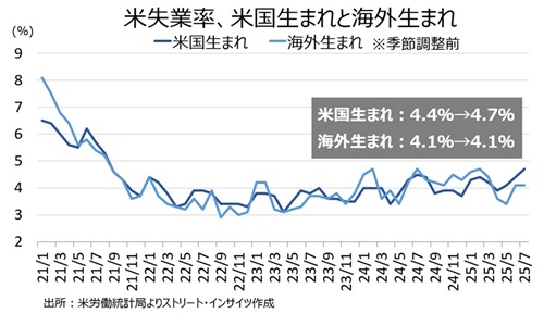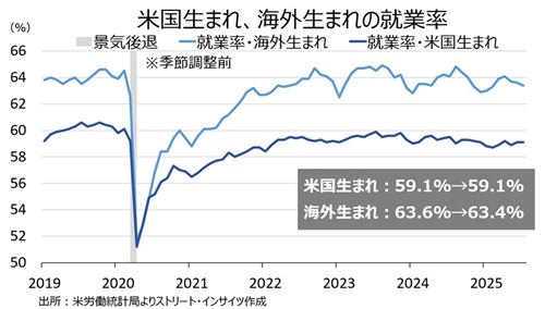 2024年の米大統領選でトランプ氏が勝利した理由は、不法入国者を含めた移民の急増だった。米議会予算局やサンフランシスコ連銀など、多くが移民の急増をめぐる影響を分析するように、コロナ禍後の足元の米労働市場にも大きな変化をもたらした。しかし、足元はトランプ政権の不法移民取り締まり強化に伴い、コロナ禍後の移民流入増の変化が巻き戻されつつある。そこで、海外生まれ(不法移民を含む)と米国生まれの雇用動向を確認してみた。