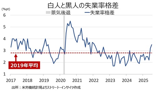 白人と黒人の失業率格差は拡大。白人の失業率が低下した一方で、黒人の失業率が上昇したため、失業率格差は前月の3.2ポイント→3.5ポイントへ拡大し、2019年平均を超え22年1月以来の高水準を迎えた。