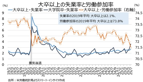 チャート:大卒以上の労働参加率、労働参加率は3カ月連続で低下し1992年のデータ公表開始以来で最低だったが、大学院卒の失業率は3カ月連続で上昇し21年3月以来の高水準