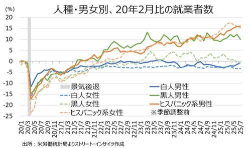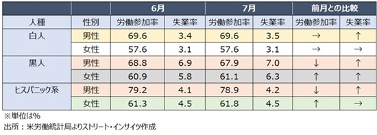 人種・男女別の失業率は、上昇が優勢黒人の男女並びに白人とヒスパニック系の男性で上昇した。労働参加率でみると、白人男性は前月比横ばい、黒人とヒスパニック系の男性は低下、黒人女性は上昇していた。ヒスパニック系の女性は、労働参加率が上昇しながらも失業率は横ばいだった。