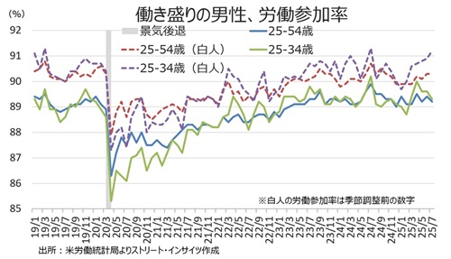 ・25~34歳(白人) 91.2%と24年7月以来の高水準、前月は90.9%、24年7月は91.3%と19年3月以来の水準に並ぶ