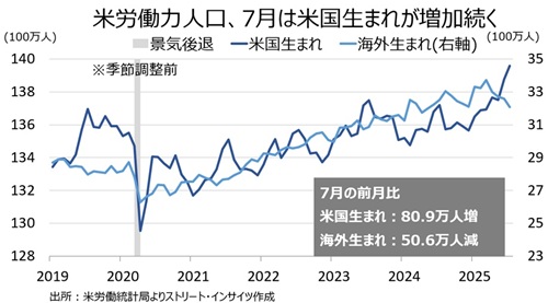労働力人口(以下、全て季節調整前の数字)にうち、米国生まれは80.9万人増(前月は126.1万人増)と2カ月連続で増加したが、海外生まれは50.6万人減(前月は13.4万人減)と4カ月連続で減少した。トランプ政権下での不法移民取り締まりの強化が影響したと考えるのが自然だ。カリフォルニア州ロサンゼルスを起点に抗議活動が広がったことが思い出される。
