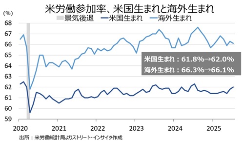 労働参加率も、明暗が分かれた米国生まれは労働力人口の増加に合わせ前月の61.8%→62.0%と24年7月以来の高水準となった。海外生まれは逆に前月の66.3%→66.1%へ低下。これらは季節調整前の数字だが、全米の労働参加率が62.2%と22年11月以来の低水準だった理由は、海外生まれが影響した可能性を示唆する。なお、海外生まれは通常、就労ビザを取得して入国した者が多いほか、家族に生活支援で頼れない事情もあり、労働参加率で米国生まれを上回る傾向が強い。