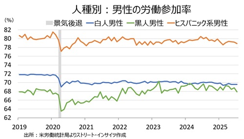 人種・男性別の労働参加率は、低下が優勢。白人は横ばいも、黒人とヒスパニック系は低下した。特に黒人男性は、23年10月以来の低水準だった。