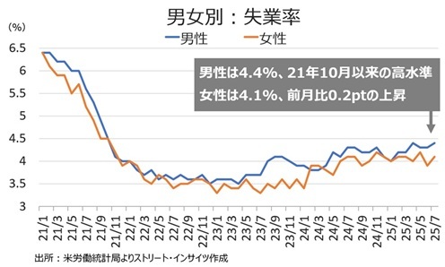 人種・男女別では労働参加率が低下した黒人とヒスパニック系の男性で失業率が上昇、非白人男性に対する労働市場の逆風を感じさせる。白人男性も、労働参加率が横ばいでも、失業率は上昇。黒人女性は労働参加率につれ、失業率は上昇し、引き続き企業が採用を絞っている様子を示唆する。