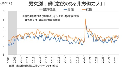縁辺労働者(ここでは直近4週間にわたり職探しをしていないが、職を求める非労働力人口)で「今すぐ仕事が欲しい」と回答した人々の数は、労働参加率が62.2%と22年11月以来の水準へ低下するなか、前月比2.4%増の617.5万人と21年7月以来の高水準だった。男性が働き盛り世代の労働参加率の改善と整合的で同3.6%減の299.5万人と2カ月連続で減少するなか3カ月ぶりに300万人を割り込んだ一方、女性は同8.8%増の318.0万人と2カ月連続で増加し4カ月ぶりの水準へ戻した。縁辺労働者は3カ月ぶりに女性が男性を上回った。女性の間で職探しが困難な状況へシフトした。