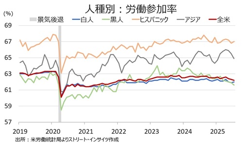 ・ヒスパニック系 61.8%、前月は61.3%と24年6月以来の低水準、24年8月は62.6%と1976年6月からのデータ公表以来で最高